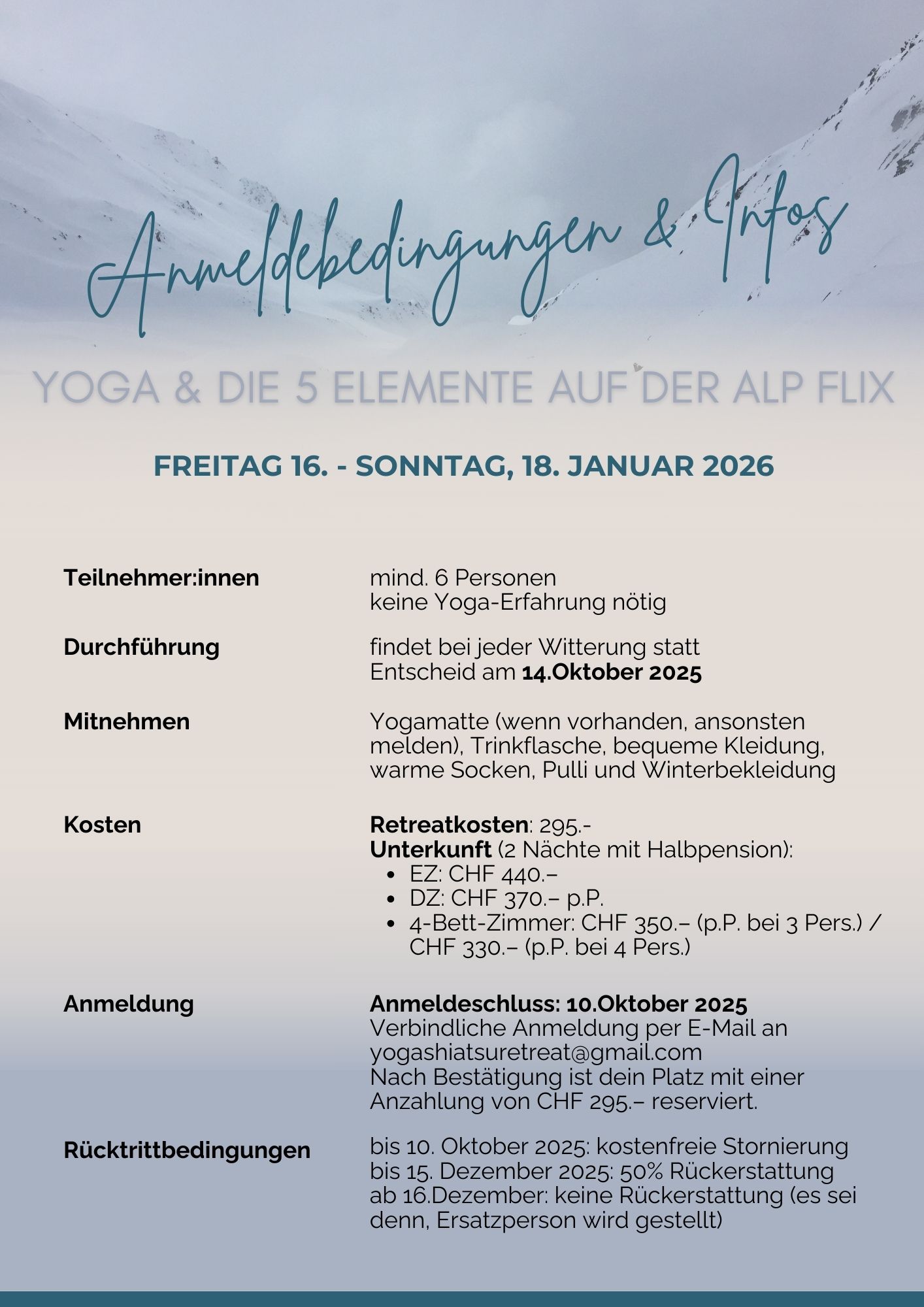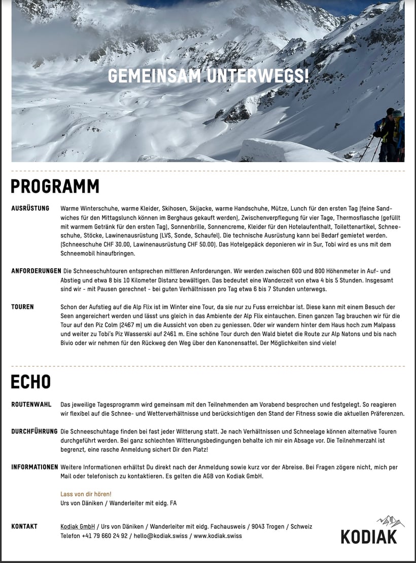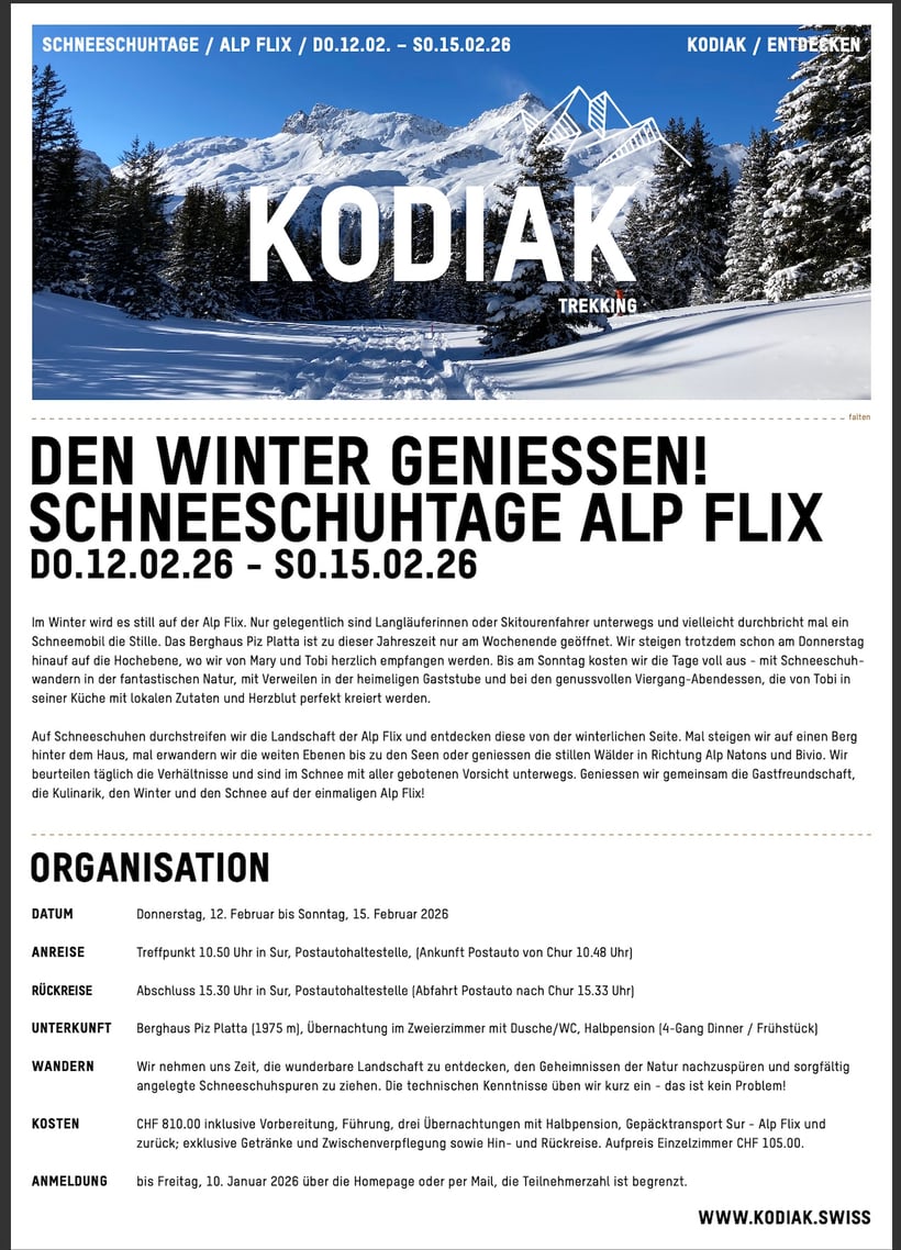 Preis: 787 Euro bei 4-6 Teilnehmer/innen. Voraussichtliche Zusatzkosten: ca. 450 Chf für 3 Nächte im DZ mit Halbpension, EZ-Zuschlag 35 Chf/Nacht, nach Verfügbarkeit und Gruppe auch Mehrbettzimmer möglich, Preise exklusive Getränke.