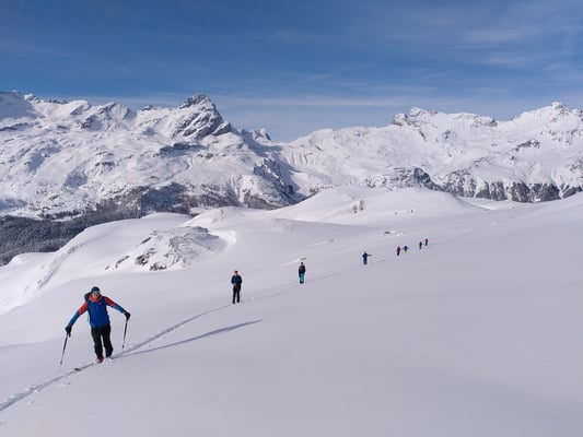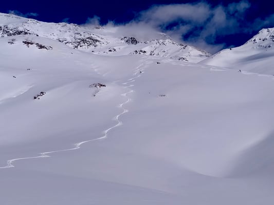 Für die weiteren Tage gibts viel zu tun: Piz Campagnung, 2826m, Piz d´Agnel, 3204m, Piz Calderas, 3397m. Weiters gibt es zahllose Varianten für große Hänge ohne Gipfel bzw. auf geheime Vorgipfel, die von zwei Tobis und einer Mary heimlich benamt wurden.